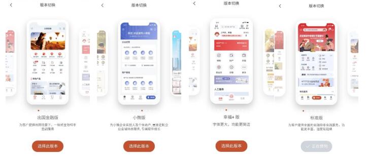 中信銀行app可以自行選擇最適合自己的版本,除了標(biāo)準(zhǔn)版之外,還有針對(duì)出國(guó)金融、小微,以及適合老人、軍人、海外、私人銀行等版本。