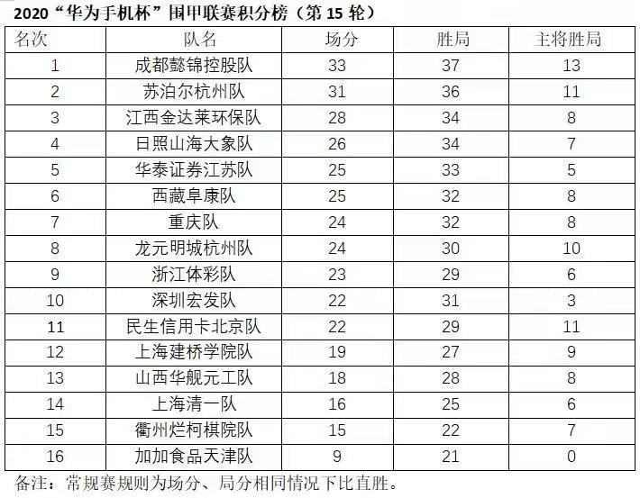 本輪深圳宏發(fā)隊1:3負(fù)成都懿錦控股隊,積22分,排名第十。本輪其它隊賽果如下:蘇泊爾杭州 3:1勝 民生信用卡北京,上海建橋?qū)W院 3:1勝 龍元明城杭州,日照山海大象 3:1 浙江體彩,西藏阜康 2:2主將勝 重慶,華泰證券江蘇 2:2主將勝 山西華