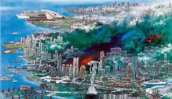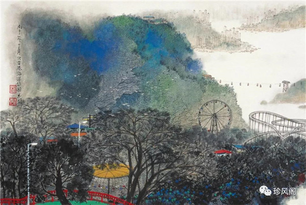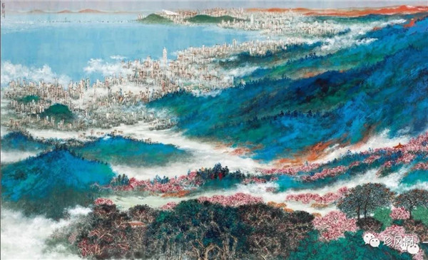 宋玉明從金陵畫派的新傳統(tǒng)跨越到城市表現(xiàn)的積彩拓墨畫法,既體現(xiàn)了現(xiàn)代化城市對于變革傳統(tǒng)的時代訴求,也體現(xiàn)了他移居深圳后這座新興城市文化對于他的深刻影響。畢竟,連續(xù)數(shù)屆的深圳水墨雙年展對于水墨在跨文化中重要作用與表現(xiàn)方法的突破,都給予他至深的思想開拓。這表明,城市山水畫已不單純是用中國畫表現(xiàn)城市的命題,而是其中能夠蘊含多少城市文化觀念與城市審美的方法,宋玉明對于城市山水畫的探索,體現(xiàn)的正是這樣一種對城市現(xiàn)代文化的思想融合性。而不拘謹于城市一磚一石、一街一道、一房一樓的描繪,著眼于發(fā)揮水墨與彩墨表現(xiàn)的自由性,抑或體現(xiàn)了人性、自然與現(xiàn)代城市共同作用的現(xiàn)代生活方式與人文理想。的確,純粹用中國畫或水墨畫來探索城市的現(xiàn)代化景觀表現(xiàn),也許只是淺層次的審美需求;而只有當把山水畫作為人與自然和諧統(tǒng)一的觀念表達植入城市現(xiàn)代化的審美訴求時,城市山水畫才能真正凸顯出其深刻的美學(xué)價值。這正是我們從宋玉明的作品里能夠讀解到的他對于城市山水畫審美理想的一種勾畫。