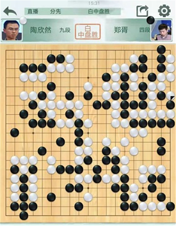 時越快棋執(zhí)黑對陣世界冠軍陳耀燁。中盤黑棋在右邊白勢中試應(yīng)手,白棋應(yīng)對松緩,被黑棋先手便宜十幾目棋,黑局面領(lǐng)先。之后黑棋行棋嚴(yán)謹(jǐn),中盤獲勝。