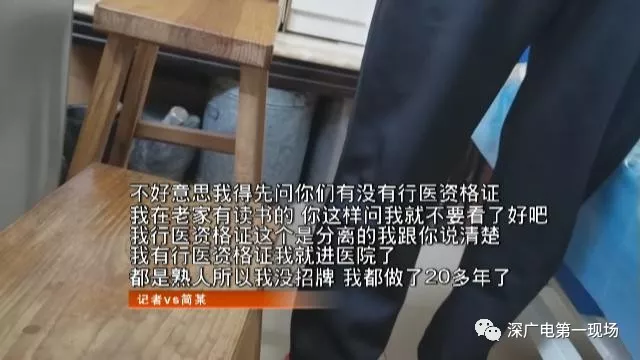 簡(jiǎn)某嘴上說他有醫(yī)學(xué)院畢業(yè)證,但最后出示的是20多年前取得的,《廣州市社會(huì)力量辦各類校班結(jié)業(yè)證書》及《中醫(yī)醫(yī)療函授學(xué)習(xí)證書》,衛(wèi)監(jiān)人員說這都不算醫(yī)師執(zhí)業(yè)資格。對(duì)于沒有資格證的問題,簡(jiǎn)某表示自己曾經(jīng)咨詢過,原來可以到湛江進(jìn)行考試,但現(xiàn)在已經(jīng)不行了。