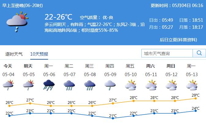 深圳特區(qū)報(bào)2019年5月4日訊(記者 方勝)深圳市氣象臺(tái)預(yù)計(jì),4日我市多云,可見陽光,局部有短時(shí)陣雨,氣溫21-26℃,中午前后體感微熱;5-8日我市將出現(xiàn)強(qiáng)降雨,日雨量最大可達(dá)暴雨,部分時(shí)間伴有雷暴和短時(shí)大風(fēng);展望9日降雨減弱。5日起我市連續(xù)多日有強(qiáng)降雨,請(qǐng)市民及時(shí)關(guān)注最新預(yù)警預(yù)報(bào)信息。