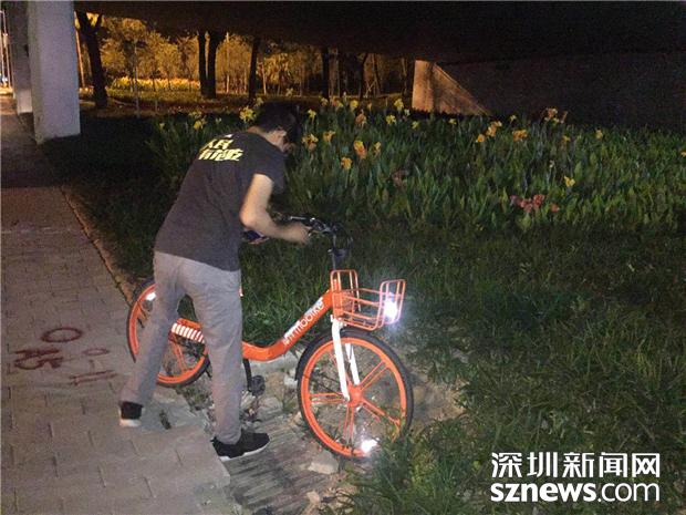 摩拜運維人員回收深圳會展中心周邊區(qū)域附近綠化帶、機(jī)動車道上滯留的單車