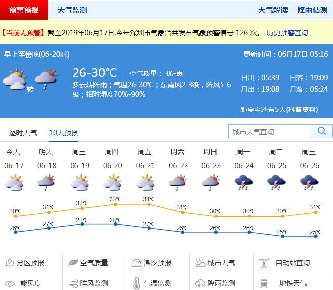 深圳新聞網(wǎng)2019年6月17日訊 深圳市氣象局預(yù)計(jì)17日白天有陣雨或雷陣雨,局部大雨;18日多云有短時(shí)陣雨或雷陣雨;19-20日多云間晴,局部地區(qū)有短時(shí)陣雨,天氣炎熱;21日多云有短時(shí)陣雨。22-24日,陰天,有陣雨或雷陣雨。