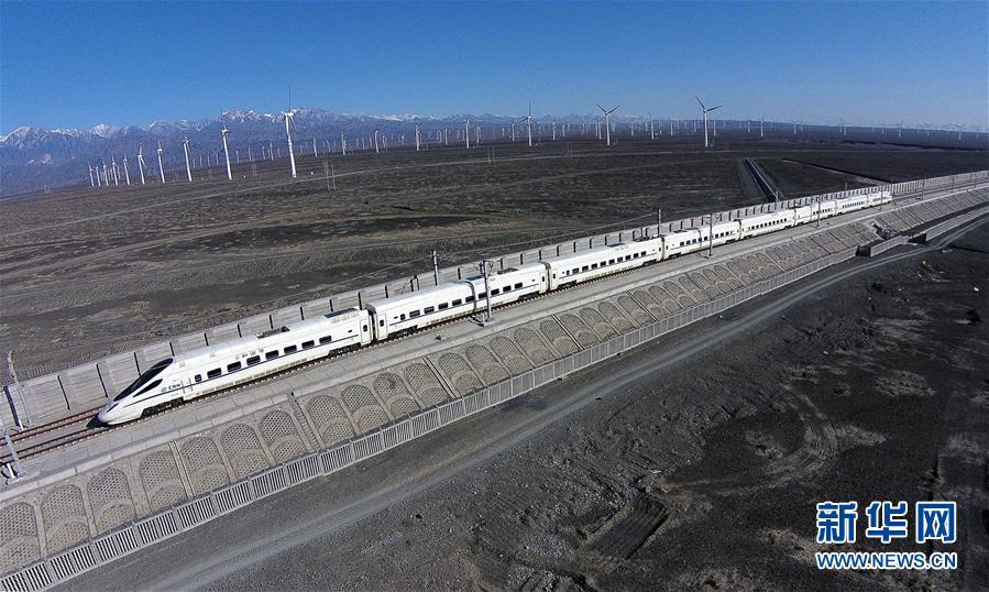 一輛和諧號動車穿行在新疆烏魯木齊達(dá)坂城風(fēng)力發(fā)電場的“風(fēng)車森林”里(2014年11月16日無人機拍攝)。今年以來,新疆穩(wěn)步推進(jìn)新能源參與“疆電外送”、擴大與燃煤自備電廠調(diào)峰替代交易等多種電力交易方式,著力破解“綠色電力”上網(wǎng)難題,新能源發(fā)電量同比增加近13個百分點,而棄電量和棄電比實現(xiàn)“雙降”,綠色發(fā)展理念進(jìn)一步落實。 新疆是我國重要的能源供應(yīng)和儲備基地,風(fēng)能、太陽能儲量豐富。近年來,新疆新能源裝機總量突破2700萬千瓦,規(guī)模和占比均居全國前列。新華社記者 江文耀 攝