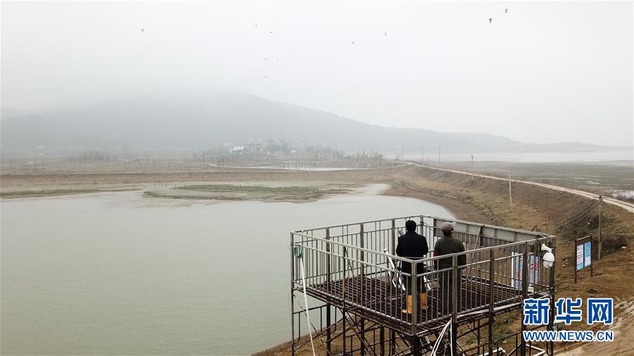 12月22日,王三益(左)在菜子湖濕地觀測候鳥(無人機(jī)拍攝)。 新華社記者 張端 攝