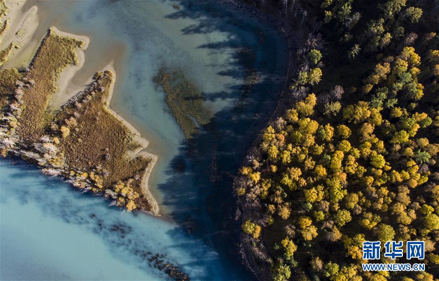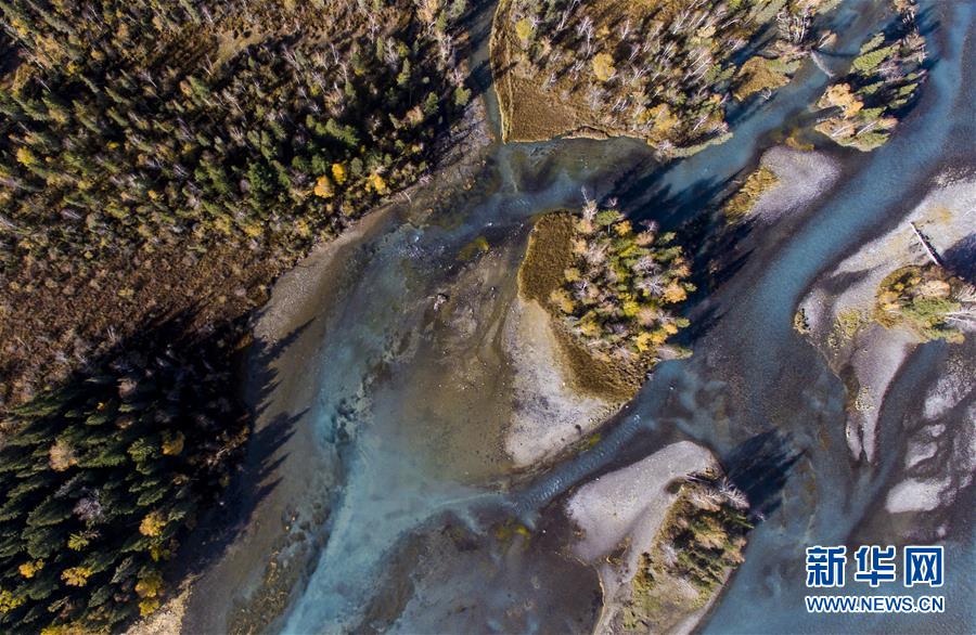 9月24日無人機(jī)拍攝的喀納斯景區(qū)風(fēng)光。新華社記者 王菲 攝