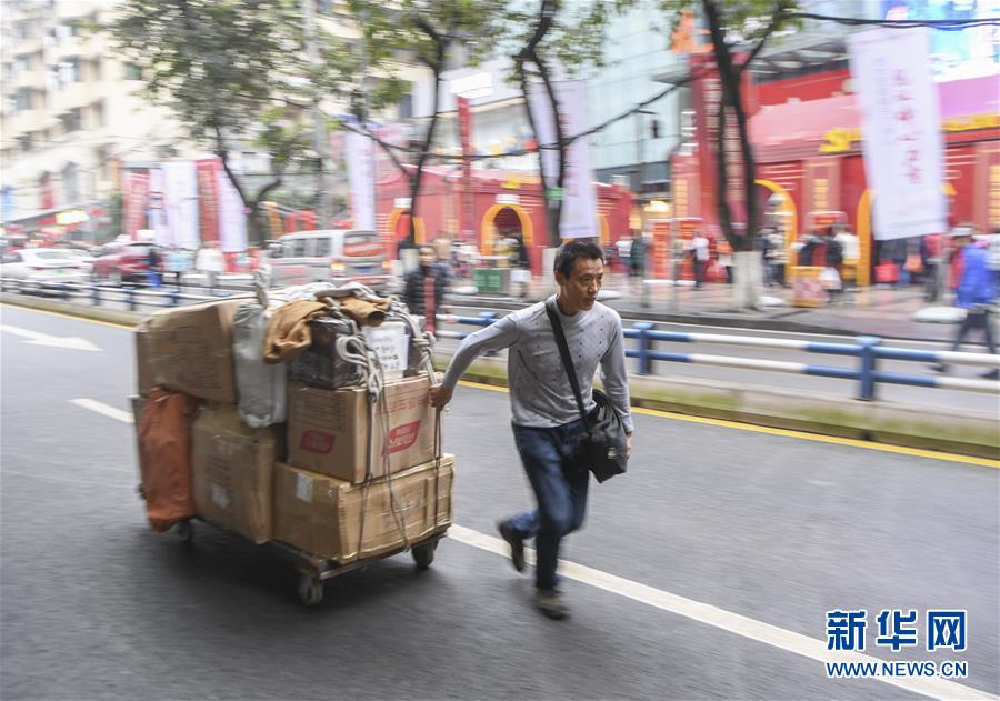 冉光輝用小板車載著貨物,前往發(fā)貨地點(diǎn)(1月5日攝)。新華社記者王全超攝