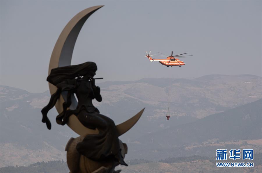 3月31日,一架參與西昌森林火災(zāi)滅火的直升機在邛海中取完水飛向火場。新華社記者江宏景攝