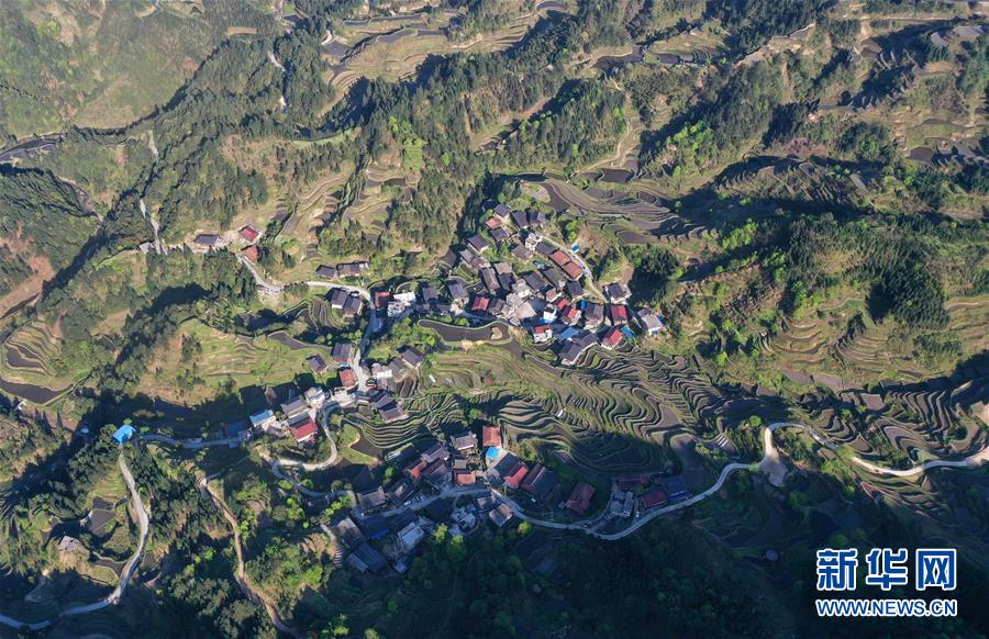 這是融水苗族自治縣桿洞鄉(xiāng)小河村高羽苗寨的木樓和梯田(3月31日攝,無人機照片)。隨著氣溫逐漸轉(zhuǎn)暖,廣西融水苗族自治縣桿洞鄉(xiāng)的苗寨梯田景色迷人,美如畫卷。新華社記者黃孝邦攝