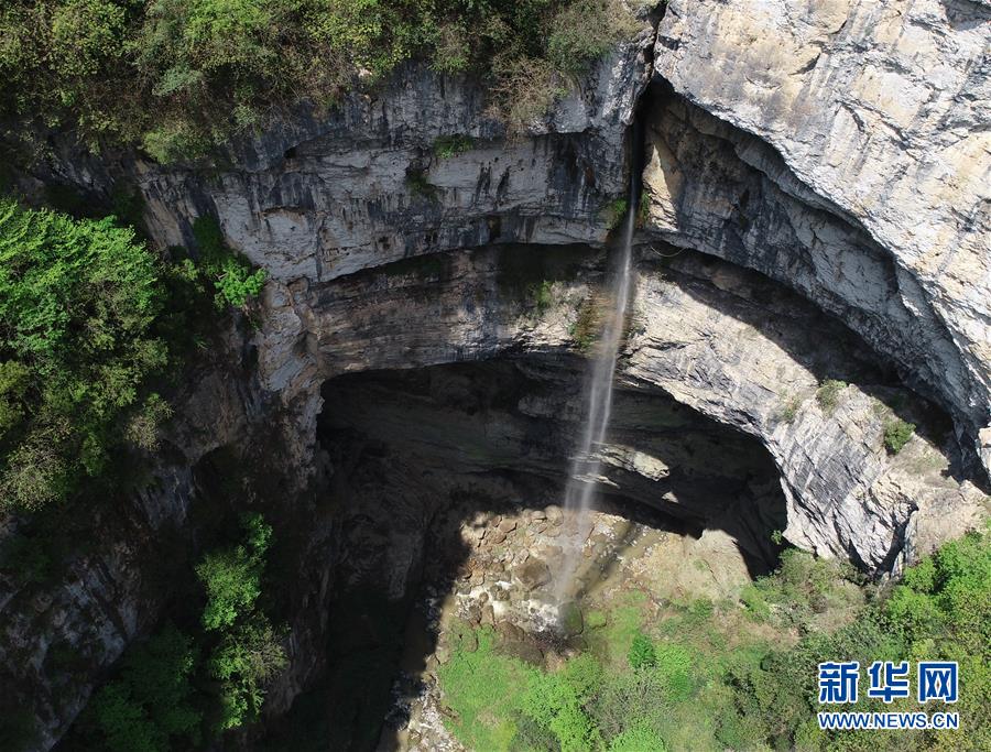這是在陜西省漢中市寧強縣火石子村用無人機拍攝的地洞河天坑內(nèi)的一處瀑布。新華社張博文攝