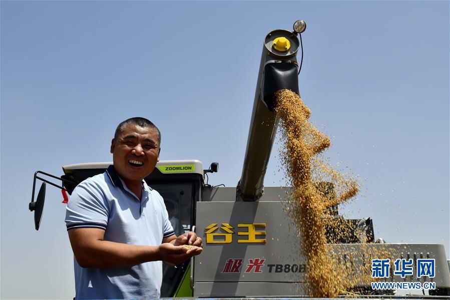 6月3日,在汶上縣郭倉鎮(zhèn),種糧大戶郭波波在收獲小麥。目前,我國第二大小麥主產(chǎn)區(qū)山東6000多萬畝小麥進入收獲階段。農(nóng)民們搶抓有利天氣,自南向北陸續(xù)開鐮。新華社記者郭緒雷攝。
