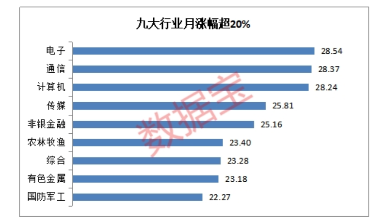 28個申萬一級行業(yè)中,有9個行業(yè)二月份的漲幅超過20%,電子、通信、計算機(jī)、傳媒、非銀金融行業(yè)漲幅超過25%,位列前五。28個行業(yè)的月平均漲幅為18.4%,行業(yè)普漲現(xiàn)象明顯。