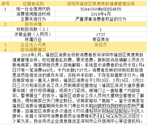 2018年1月,福田區(qū)消委會(huì)收到消費(fèi)者投訴深圳市福田區(qū)美度美膚健康管理會(huì)所,稱經(jīng)營(yíng)者亂扣費(fèi),要求退回余額(會(huì)員卡余額1737元)。接到投訴后調(diào)解人員多次致電商家,商家楊姓負(fù)責(zé)人回電解釋:系統(tǒng)顯示消費(fèi)者的會(huì)員卡在1月4日只有一筆消費(fèi)448元,卡內(nèi)余額1737元;消費(fèi)者反映的收到扣款短信是店員短信發(fā)送的操作失誤,實(shí)際并未扣款,不存在故意欺詐行為。隨后商家電話一直無(wú)人接聽(tīng),福田區(qū)消委會(huì)于3月15日、3月19日、3月23日三次分別派出多名工作人員到商家經(jīng)營(yíng)地址(福田區(qū)濱河大道京基御景華城)進(jìn)行現(xiàn)場(chǎng)調(diào)查,現(xiàn)場(chǎng)大門(mén)緊閉,玻璃門(mén)上一直貼著“內(nèi)部培訓(xùn),暫停營(yíng)業(yè)”的告示,福田區(qū)消委會(huì)工作人員向大廈物業(yè)管理處了解情況,得知商家已關(guān)門(mén)停業(yè)數(shù)日,該商家疑似“跑路”。鑒于該商家在福田區(qū)消委會(huì)調(diào)查期間無(wú)故關(guān)門(mén)停業(yè)并失聯(lián),致使消費(fèi)者權(quán)益受到嚴(yán)重侵害,且福田區(qū)消委會(huì)多次遞送《約談通知書(shū)》到商家經(jīng)營(yíng)地,均無(wú)人接收。依據(jù)《深圳市消費(fèi)者委員會(huì)消費(fèi)維權(quán)信用信息管理辦法(試行)》第九條,我會(huì)將該企業(yè)信息推送至深圳市公共信用中心等征信機(jī)構(gòu)。