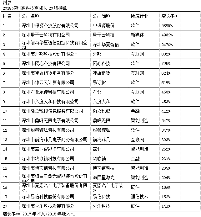 今年,榮登“深圳20強(qiáng)”三甲的獲獎(jiǎng)企業(yè)分別為深圳中琛源科技股份有限公司、深圳量子云科技有限公司和深圳前海華夏智信數(shù)據(jù)科技有限公司,他們在過去三年中表現(xiàn)出的平均增長率分別為5,869%、4,932%和2,470%。本年度入選“深圳20強(qiáng)”的企業(yè)除了軟件、硬件、互聯(lián)網(wǎng)和通訊技術(shù)外,也不乏其他新興領(lǐng)域,如新媒體、智能制造和金融科技。此外,為表彰深圳市當(dāng)?shù)乇憩F(xiàn)優(yōu)秀且極具潛力的初創(chuàng)企業(yè),今年共有20家企業(yè)獲選“深圳明日之星”,它們來自多個(gè)不同的領(lǐng)域,包括人工智能、智能設(shè)備、電子商務(wù)、教育、生物醫(yī)藥、金融科技和互聯(lián)網(wǎng)平臺(tái)服務(wù)等 (詳見附錄)。獲選成為“深圳20強(qiáng)”和“深圳明日之星”的企業(yè),將自動(dòng)成為“中國高科技高成長50強(qiáng)”(簡稱“中國50強(qiáng)”)和“中國明日之星”的候選企業(yè),并在今年11月與全國其他入圍企業(yè)角逐,躋身全國增長最快、最具發(fā)展?jié)摿Φ母呖萍计髽I(yè)之列。
