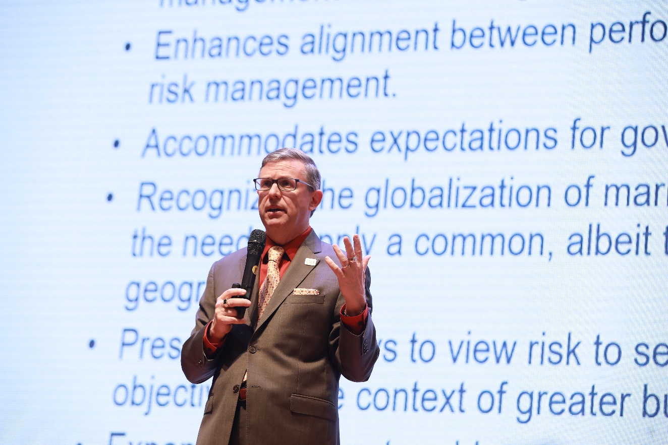 IMA總裁兼首席執(zhí)行官 Jeffrey Thomson以“企業(yè)風(fēng)險(xiǎn)管理——風(fēng)險(xiǎn)與戰(zhàn)略和績(jī)效協(xié)調(diào)一致”為主題,圍繞美國反虛假財(cái)務(wù)報(bào)告委員會(huì)下屬的發(fā)起人委員會(huì)C OSO的企業(yè)風(fēng)險(xiǎn)管理最新框架,與現(xiàn)場(chǎng)嘉賓分享了企業(yè)風(fēng)險(xiǎn)管理所需要注意的問題。Thomson表示,風(fēng)險(xiǎn)管理并非單一孤立,而應(yīng)當(dāng)貫穿于戰(zhàn)略制定、績(jī)效考核、內(nèi)部控制等企業(yè)管理的方方面面。他強(qiáng)調(diào),風(fēng)險(xiǎn)管理并非是“杜絕”風(fēng)險(xiǎn),而更重要的是確定風(fēng)險(xiǎn)偏好,管控風(fēng)險(xiǎn)的同時(shí)分析發(fā)現(xiàn)企業(yè)發(fā)展的機(jī)遇。