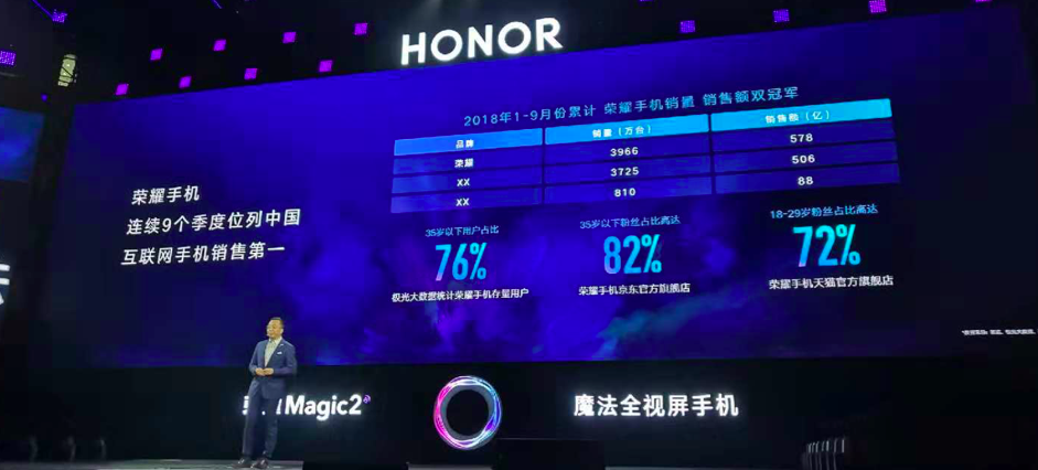 2018年,在全球智能手機市場增長遇冷的大勢下,榮耀繼續(xù)乘風破浪的亮眼表現(xiàn)。在國內市場,連續(xù)9個季度位列中國互聯(lián)網(wǎng)手機銷售第一,進一步夯實互聯(lián)網(wǎng)手機第一品牌的地位。據(jù)賽諾數(shù)據(jù)顯示,2018年1-9月,榮耀手機以3966萬臺的銷量、578億元的銷售額,雙雙進入中國手機市場的前五,這也是唯一入圍TOP5的互聯(lián)網(wǎng)手機品牌。同時,榮耀在全球74個國家市場以榮耀模式縱深布局、深度耕耘,強勢進入快速增長通道。