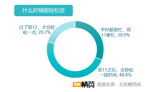 忙碌是工作的常態(tài),雙11只是更忙一點(diǎn)罷了。48.4%的受訪者表示雙11以后,會(huì)輕松一段時(shí)間;30.9%的職場精英表示,平時(shí)都很忙,只是雙11更加忙碌罷了;而20.7%的人,要過了雙十二才會(huì)輕松一點(diǎn)。年底的市場,一直是商家們的戰(zhàn)場,雙11以后,雙12、圣誕節(jié)、元旦、春節(jié)接踵而至,輕松只是短暫的停留,促銷才是長期的工作。