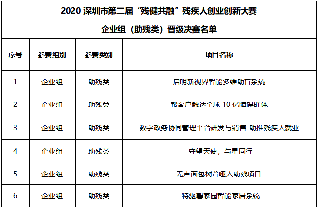 2020深圳市第二屆“殘健共融”殘疾人創(chuàng)業(yè)創(chuàng)新大賽企業(yè)組(自強(qiáng)類(lèi))晉級(jí)決賽名單