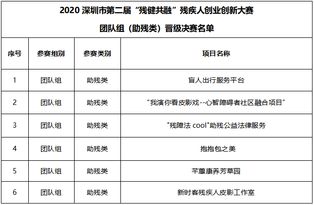 2020深圳市第二屆“殘健共融”殘疾人創(chuàng)業(yè)創(chuàng)新大賽團(tuán)隊(duì)組(助殘類(lèi))晉級(jí)決賽名單