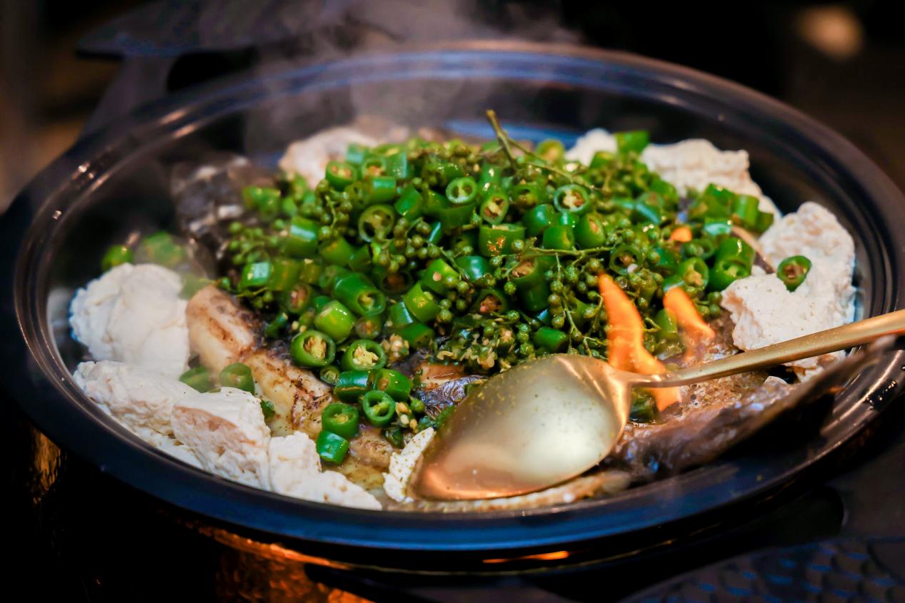除了視覺感官外,探魚全新lab店的產品完全顛覆了探魚以往的產品結構和產品體驗,所有的產品都以“極致釋放”為準則,涼菜更冰爽,熱菜更火熱,更高的顏值、味道更加的讓人印象深刻,有好玩、驚喜的感覺。探魚的經典產品“鮮青椒烤魚”也在lab店有口味上和形式上的升級,味道上加重了核心的“爽麻”的口感,上菜形式也增加了添酒增香、點火炙烤等充滿儀式感的內容。提高菜品品質的同時,也使顧客擁有了更別致的用餐體驗。