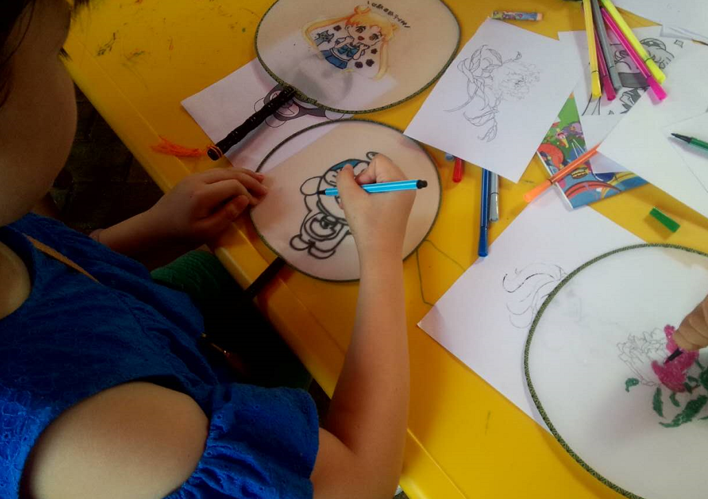 而在所有體驗項目中,扇子彩繪成為人氣最旺的一個體驗項目。從活動開始,一波又一波的小朋友涌進(jìn)扇子彩繪體驗區(qū)。有的家長和孩子齊上陣,挑選好自己喜歡的扇面后,就在深圳國子監(jiān)文化傳播有限公司的專業(yè)老師指導(dǎo)下開始精心創(chuàng)作,充滿童趣的卡通畫、意境悠遠(yuǎn)的山水畫、栩栩如生的工筆畫,每一幅作品都引來眾多的圍觀贊嘆。