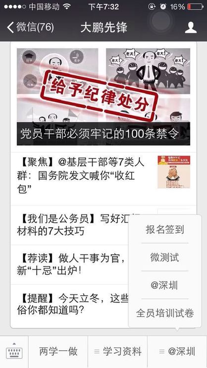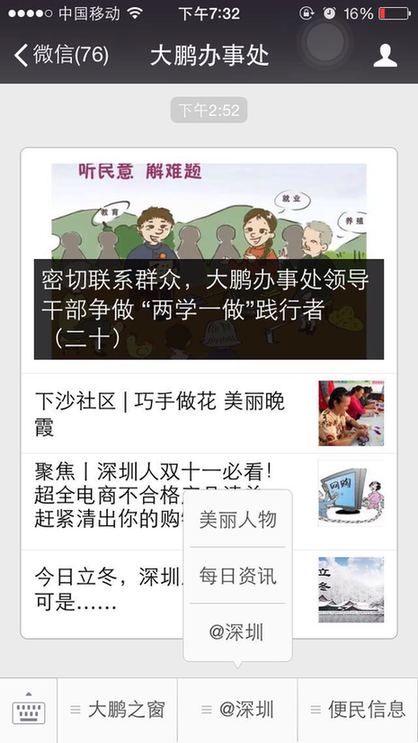 ??? 截止到11月7日,大鵬新區(qū)已有大鵬先鋒、大鵬新區(qū)社區(qū)家園網(wǎng)、大鵬公共事業(yè)、筑夢(mèng)大鵬、、大鵬辦事處等多家政府官方微信公眾號(hào)入駐了@深圳。